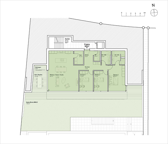 • Seitlich gelegener, überdachter Sitzplatz als Wohnraumerweiterung